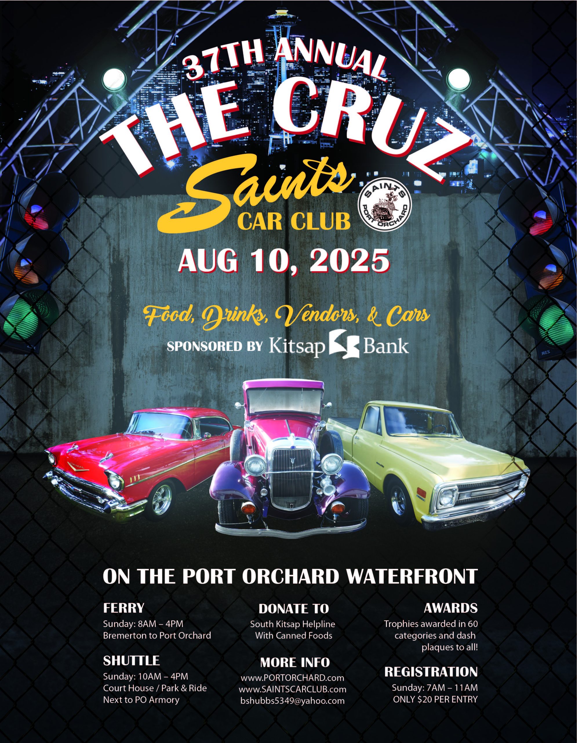 The 2025 Cruz Car Show was a major success, featuring 500+ cars in downtown Port Orchard on 8/10/2025. The winners and sponsors are listed below.